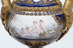 Garniture de cheminée décor aux sphinges en porcelaine émaillée et bronze doré composée d'une pendule surmontée d'un vase couvert. Mouvement de la Maison Prosper Roussel Place Vendôme Paris et d'une paire de candélabres à six bras de lumière à décor peint polychrome de Putti, de paysages animés aux oiseaux et au château et d'une paire de bougeoirs assortis. Epoque Fin XIX° ( 64x28,5x20 cm pendule)