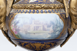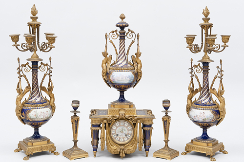 Garniture de cheminée décor aux sphinges en porcelaine émaillée et bronze doré composée d'une pendule surmontée d'un vase couvert. Mouvement de la Maison Prosper Roussel Place Vendôme Paris et d'une paire de candélabres à six bras de lumière à décor peint polychrome de Putti, de paysages animés aux oiseaux et au château et d'une paire de bougeoirs assortis. Epoque Fin XIX° ( 64x28,5x20 cm pendule)